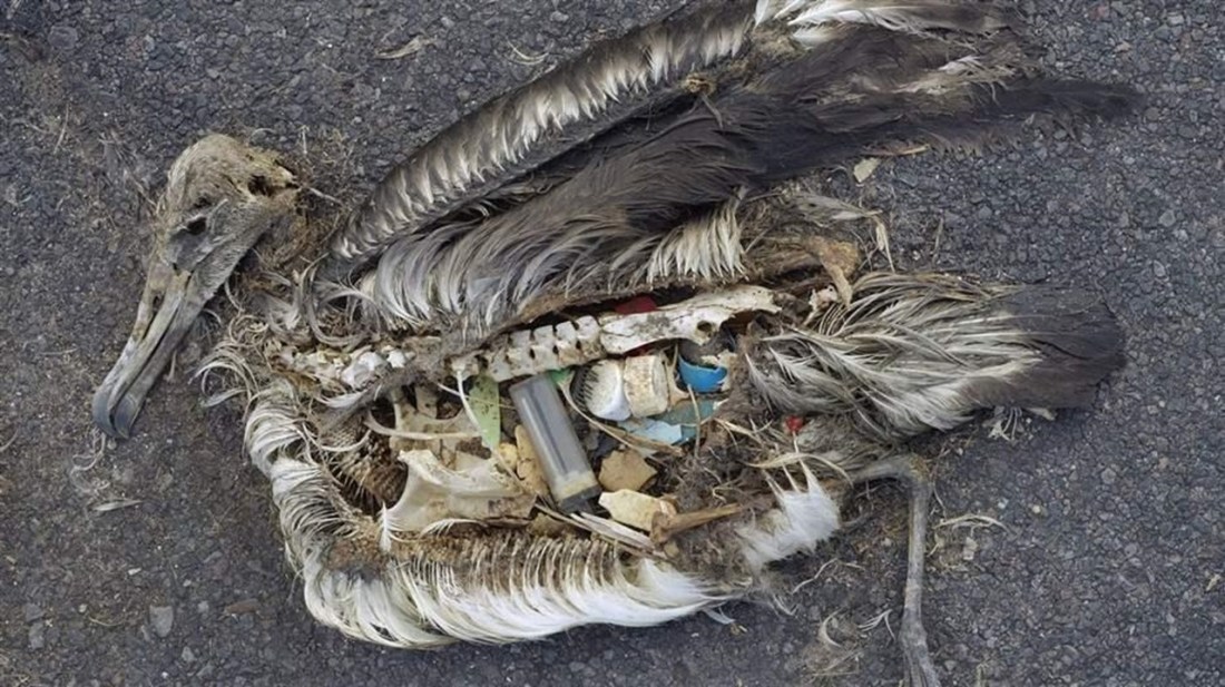A dead albatross chick found on Midway Atoll in the Pacific Ocean with plastic debris in its stomach.