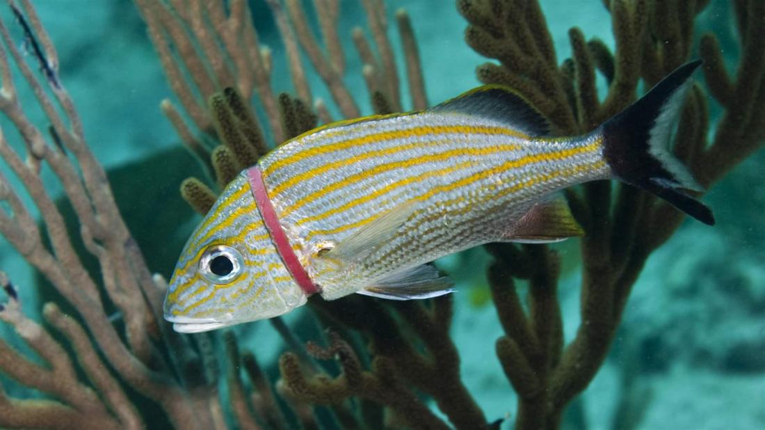 A plastic band restricts the growth of a blue-striped grunt fish in the Caribbean Sea.